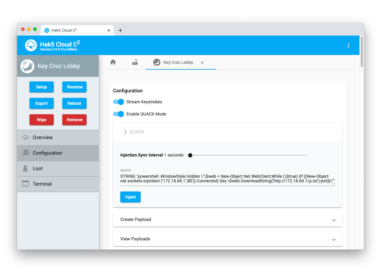 Pentest from anywhere online with the free self-hosted Cloud C2 and watch keystrokes in real-time. Or inject your own keystrokes live, exfiltrate loot, manage payloads, and even get a root shell for advanced attacks right from your web browser.