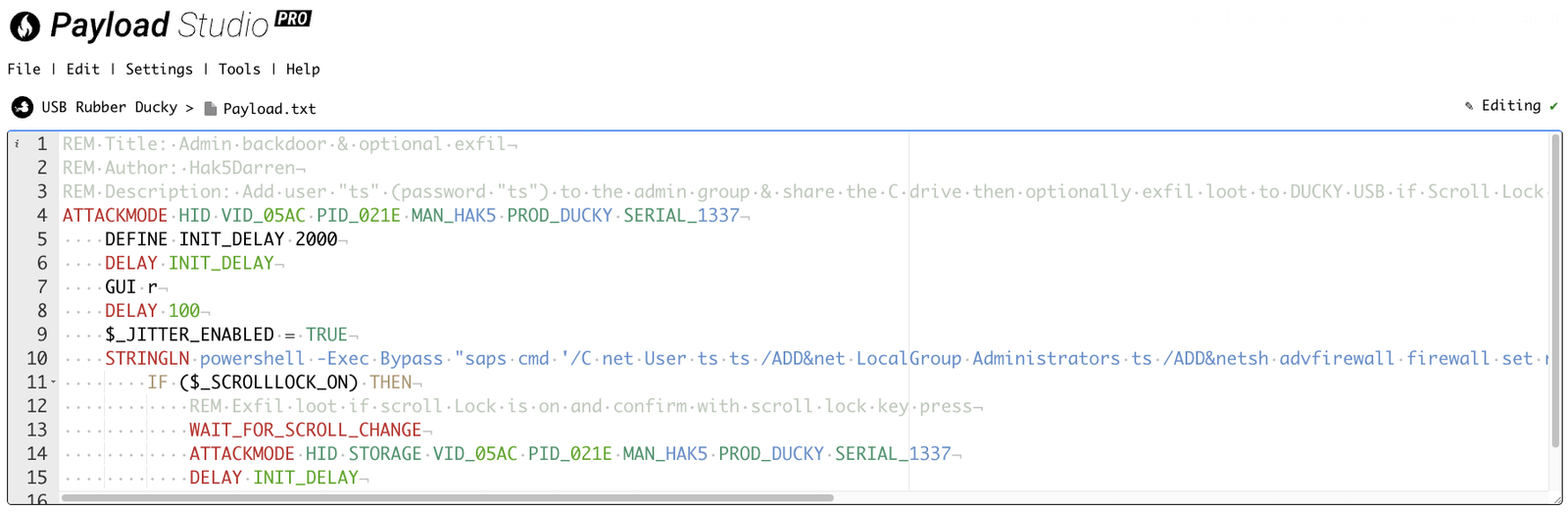 Take your DuckyScript™ payloads to the next level with this full-featured, browser-based development environment.